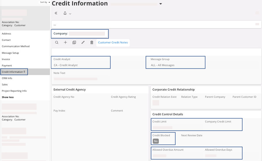 | Credit Blocked | If this checkbox is selected, then the customer is blocked. | Yes | Yes/No |