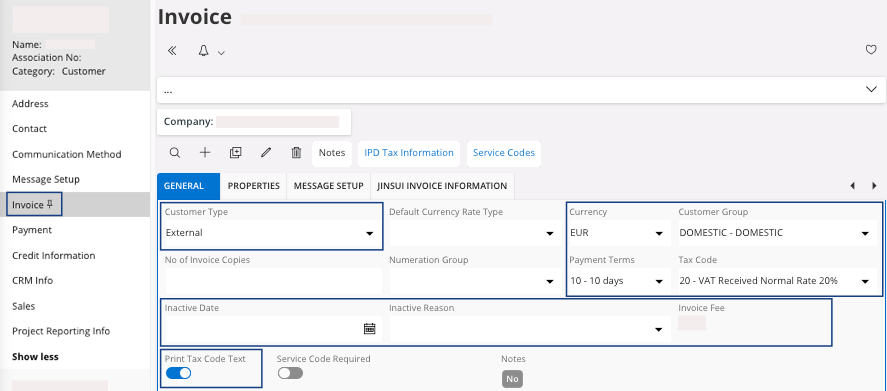 | Tax Code | This tax code is, by default, only used in manual customer invoices without any connection to orders and sales parts. | No | 20 |