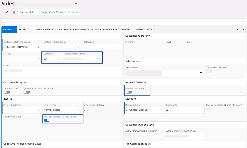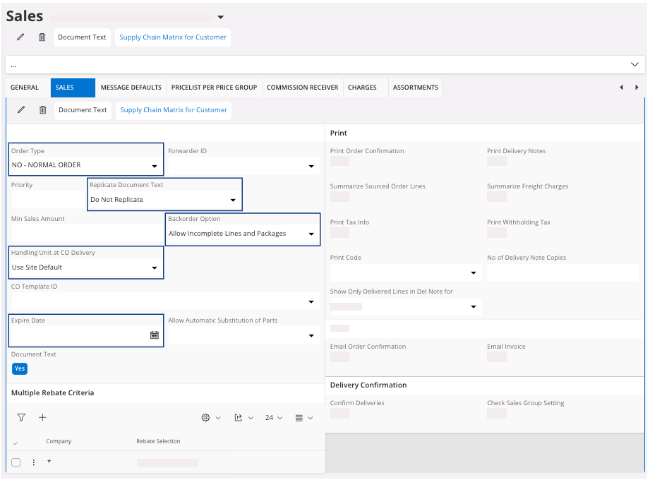Field Description Mandatory Example Order Type The order type is used to define flows related to order management. It can be configured directly on the order and is not set by default on the customer. No MPU Replicate Document Text Yes Do Not Replicate Backorder Option To define how the system manages orders during reservation, delivery note creation or during the confirmation of picking. Yes Allow Incomplete Lines and Packages Handling Unit at CO Delivery Yes Use Site Default Expire Date The end date for customer transactions. No 01/01/2022 - Charges tab allows you to