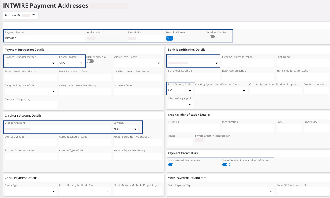 Field Description Mandatory Example Payment Method Payment method for this account. Yes INTWIRE Address ID Address ID associated to the bank account of your supplier. Yes Address 1 Description Account description. Yes Main Account Supplier Default Address Checked if it is the default address. No Yes/No Blocked for Use Checked if it is blocked for use. No Yes/No Payment Transfer Method Always TRF. Yes TRF Charge Bearer Always SHAR. Yes SHAR BIC BIC/SWIFT code for the bank account. Yes ############ Bank Country Code Bank account country code Yes US Creditor Account Supplier bank account number. Yes Currency Bank account currency. Yes USD Unstructured Payments Only Must be selected. Yes Yes Show Detailed Postal Address of Payee Must be selected. Yes Yes
