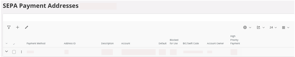 Field Description Mandatory Example Payment Method Payment method for this account. Yes SEPA Address ID Address ID associated to the bank account of your supplier. Yes Address 1 Description Account description. Yes Main Account Supplier Account IBAN account for SEPA. Yes FR############### Default Checked if it is the default account. No Yes/No Blocked for Use Checked if it is blocked for use. No Yes/No BIC/Swift Code SWIFT code for the bank account. Yes ############ - For a INTWIRE payment: