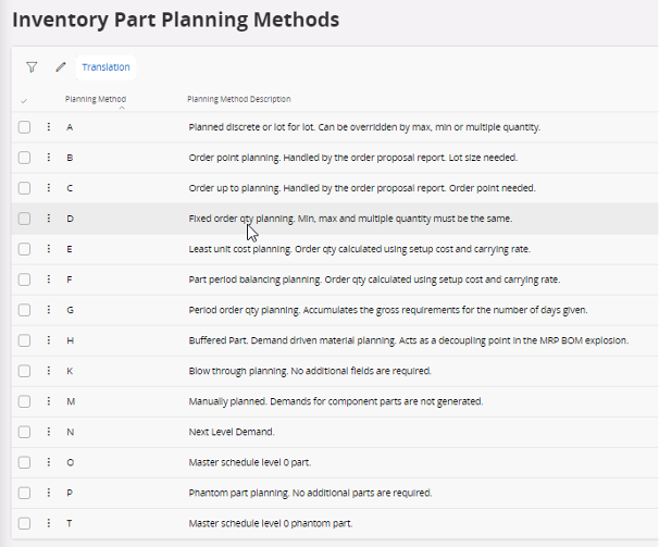 A planning method is a process of stock calculation. When your stock decreases, you need to decide according to your parts or your company which method you want to use to reorder parts.