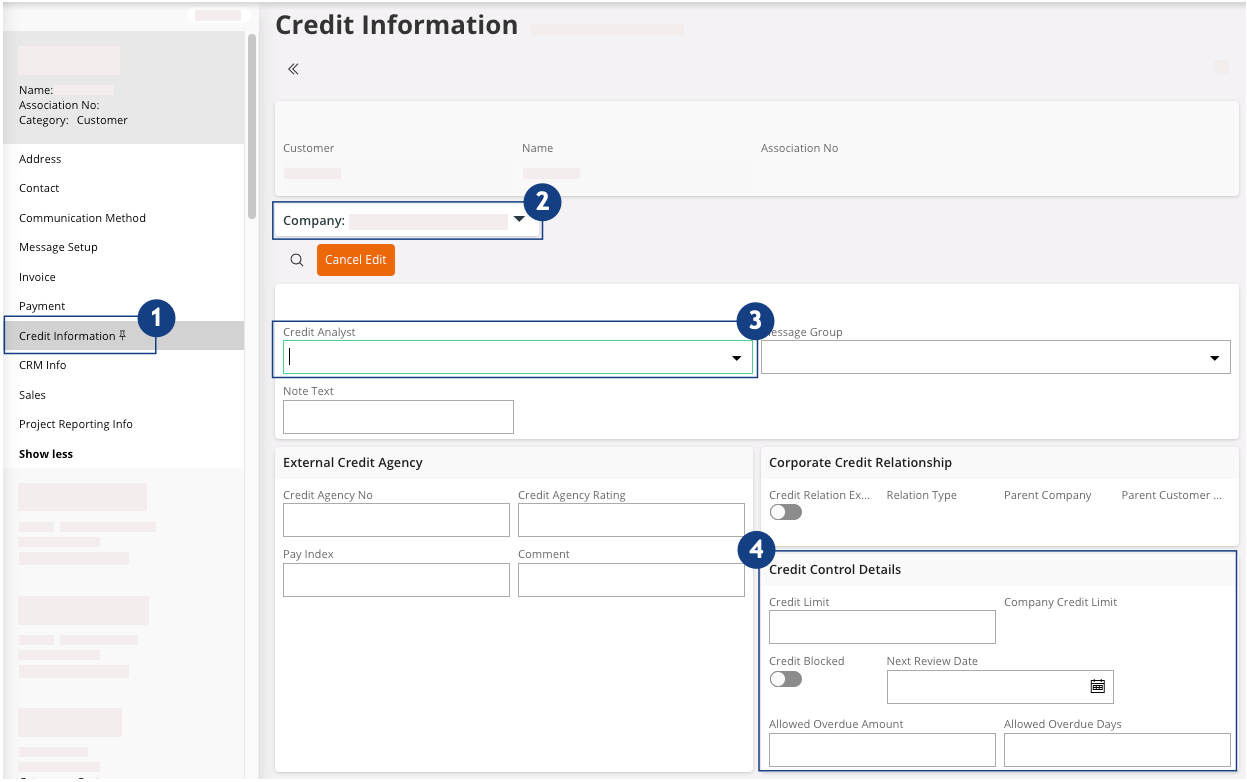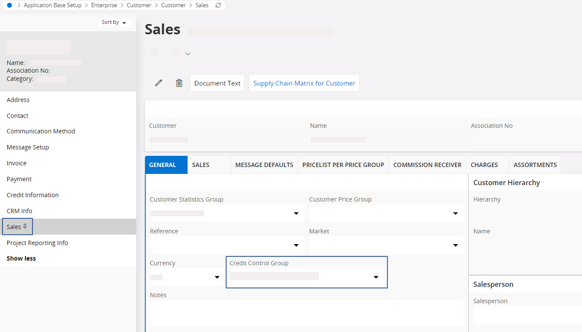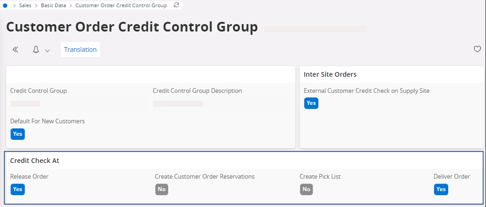 Note:This field is linked to the configuration in the page Customer Order Credit Control Group that defines when the automatic check is performed.This process impacts the customer order flow but not the sales quotation flow.