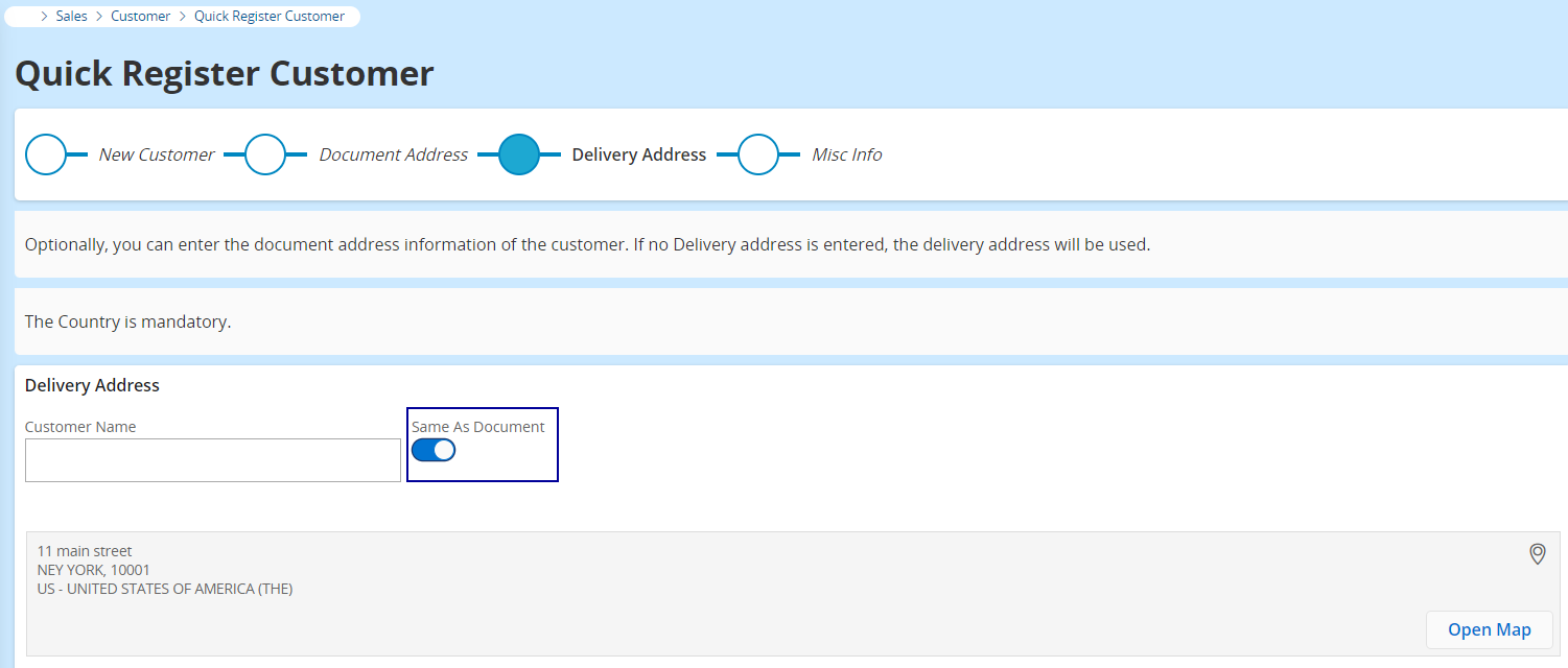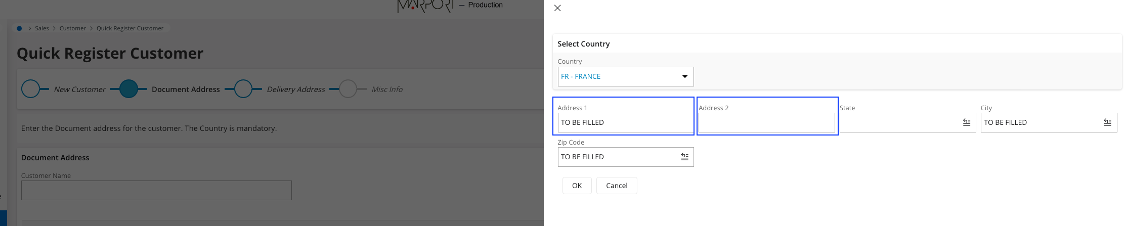 Note:Address 1 and Address 2 fields are limited to 30 characters maximum. Make sure to respect this limit or it will block the customer creation.