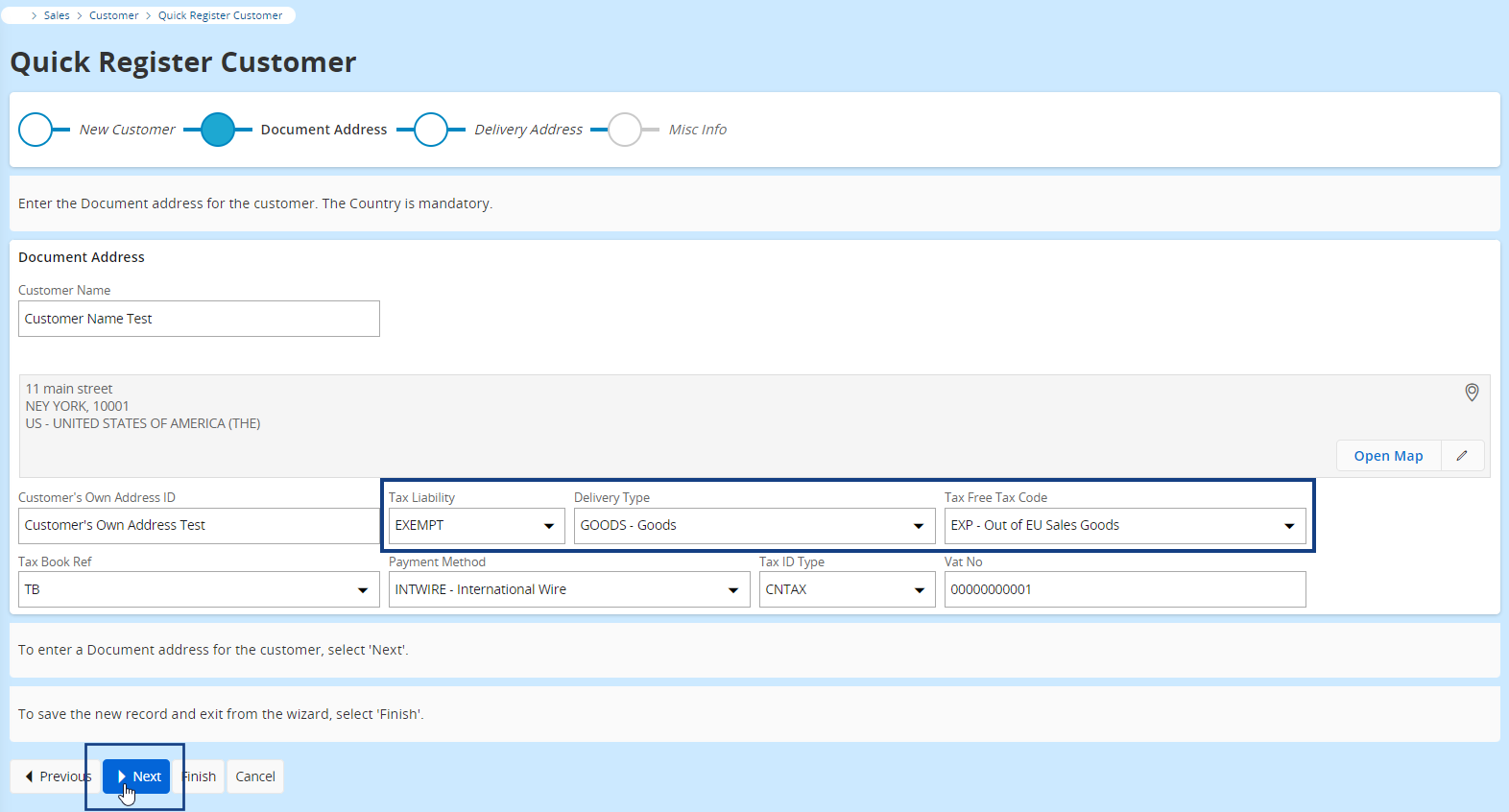 - Delivery Type: if tax liability is set to EXEMPT, select the value *.