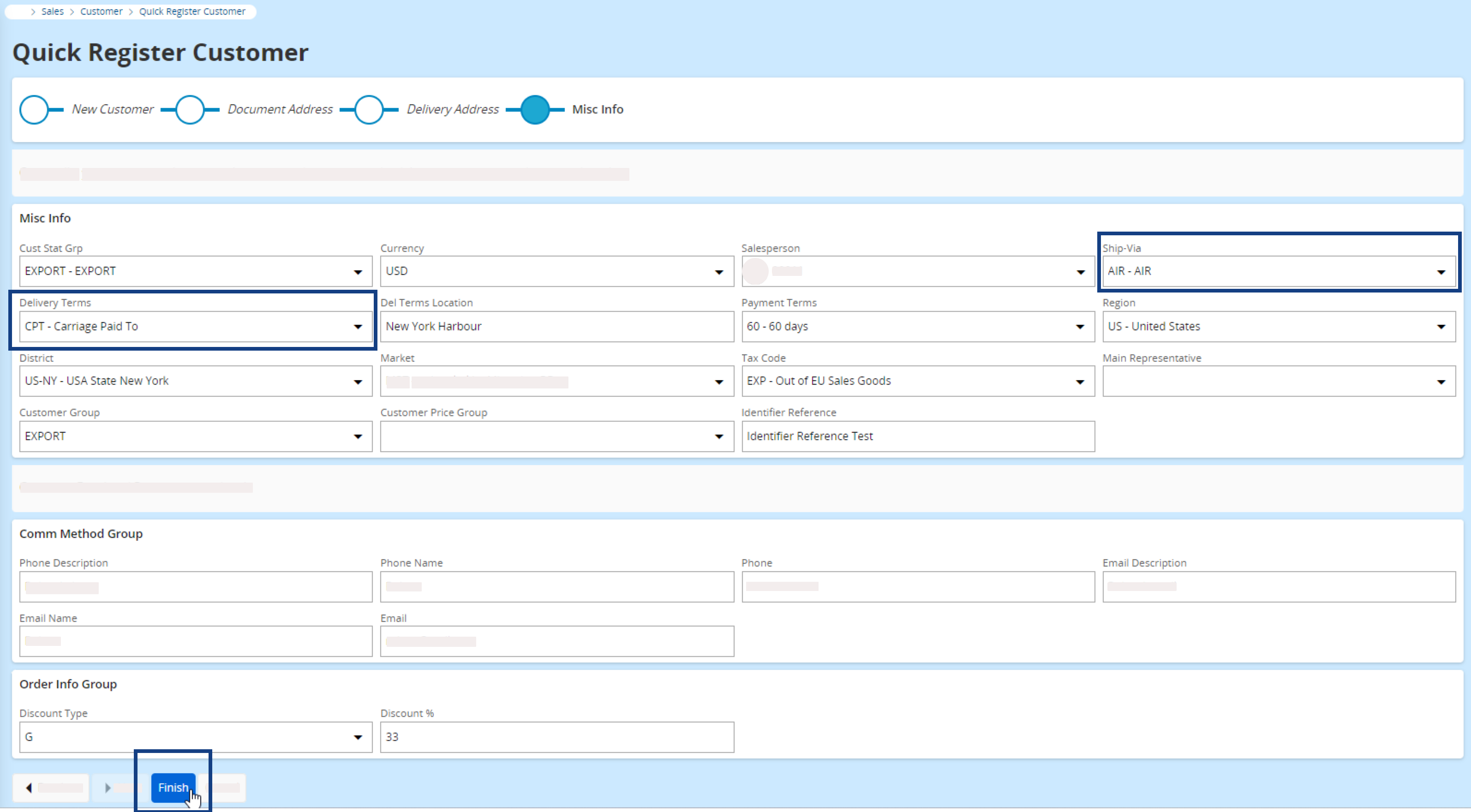 Complete the following mandatory fields: Ship-via and Delivery Terms.