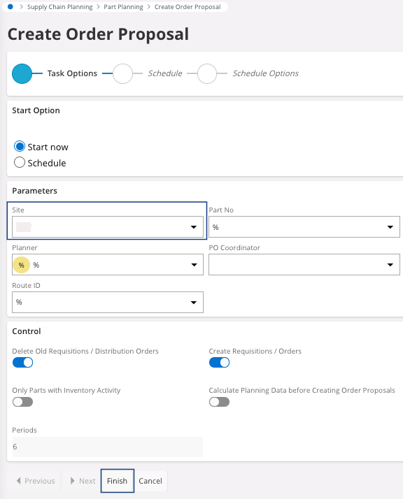 Note:This order proposal take into account quantity in Stock, Reserved, Open Customer Order, Open Purchase Order and their Due Date, Ship Planned Date and Received Planned Date. Details for a part is available on Inventory Part Availability Planning.