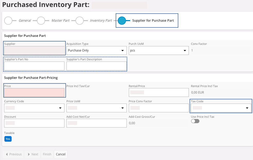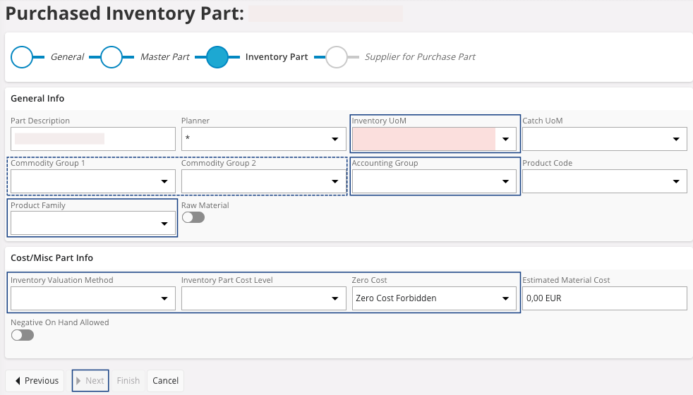 - In the Cost/Misc Part Info area, fill the fields Inventory Valuation Method with Weighted Average, Inventory Part Cost Level with Cost Per Part and Zero Cost with Zero Cost Forbidden.