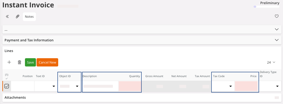 If you have a specific requirement that you cannot solve with a purchase order based on a customer invoice, then contact your IFS Cloud internal support to configure an instant invoice according to your needs.