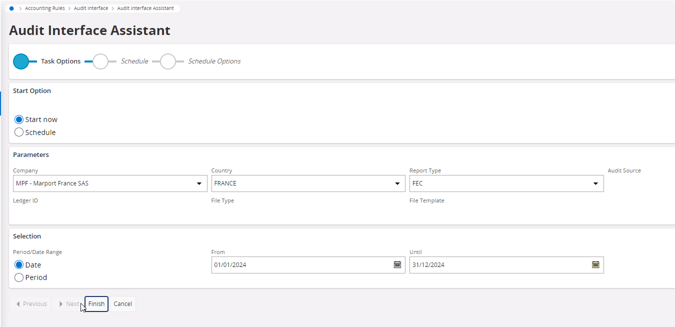 In the example below, the user will export a file of accounting entries for the french tax administration.