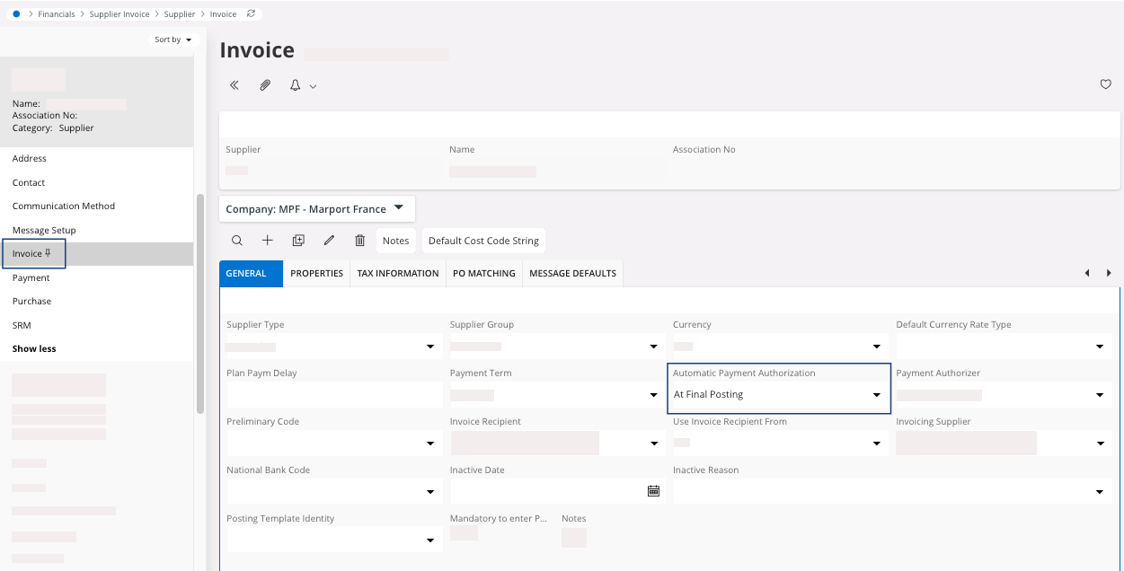 - On the page Invoice, in the tab General, change the field Automatic Payment Authorization to At Final Posting.