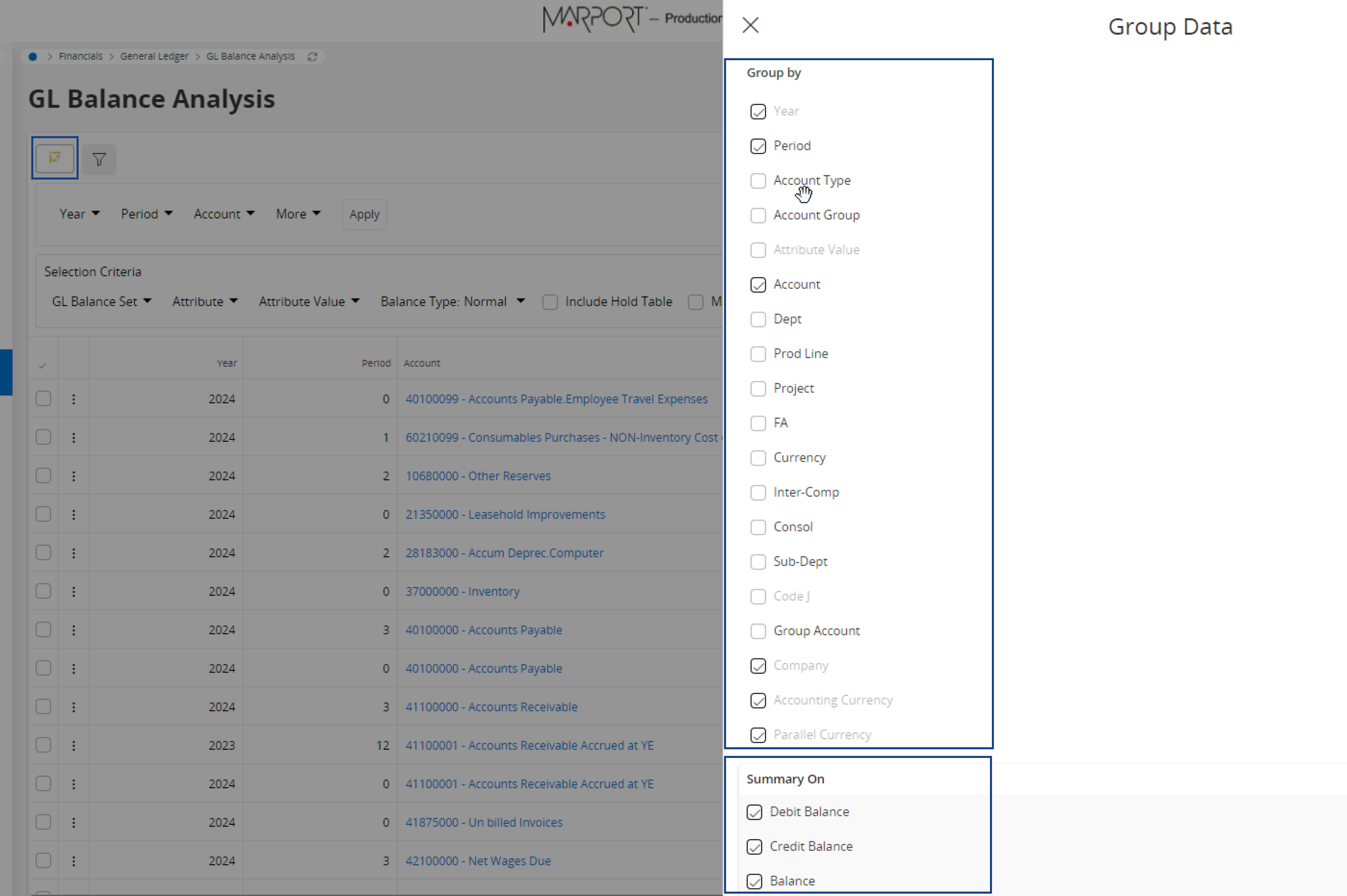 Important:To display a Year to Date view, make sure to:- deselect Period from the Group By criteria,