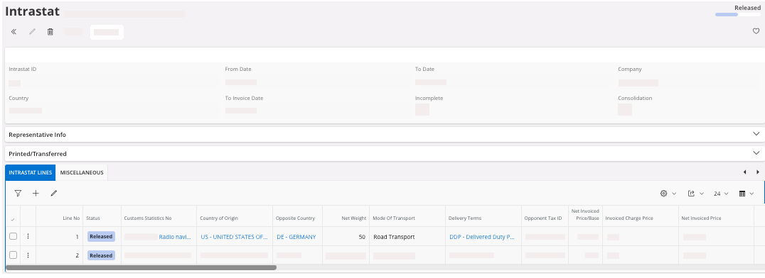 - Net Invoiced Price/Base: the invoiced price per inventory unit for the Intrastat line.