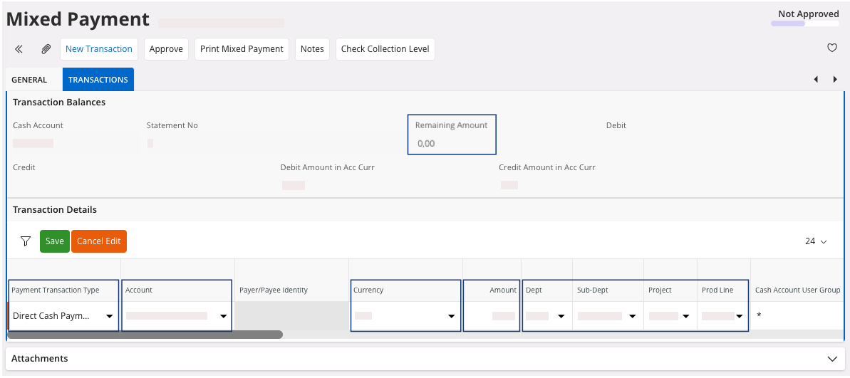 - Enter the payment Amount. If you entered correctly the Balances in Accounting Currency in the General tab. You can check in the area Transaction Balances, in the field Remaining Amount which transaction you need to do. This field must show 0 when transaction lines are correctly filled.