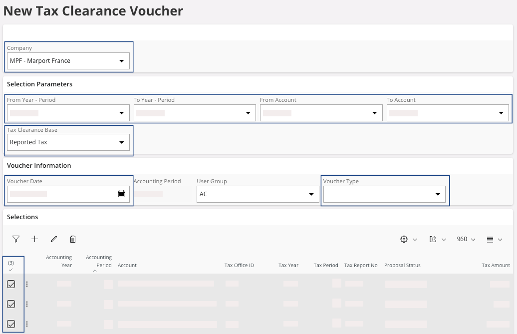 - In the field Tax Clearance Base, you must select Reported Tax.