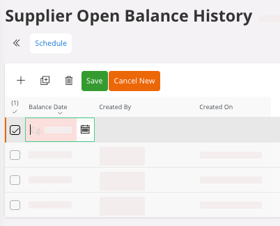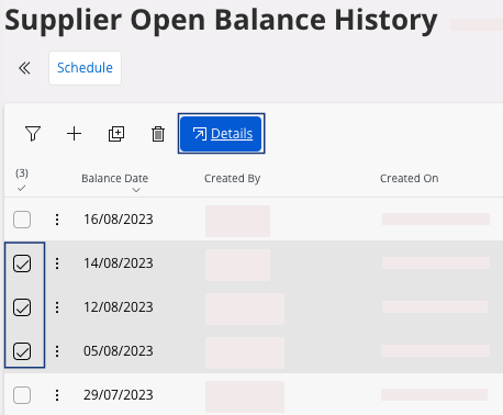 In this example, the supplier open balance history includes three dates. Select