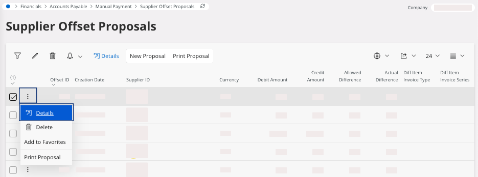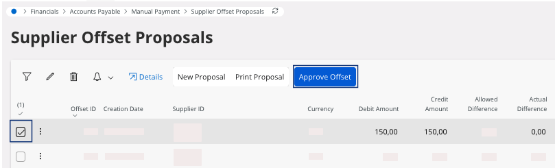 Tip:Use filters, for example the Creation Date to find your open proposals.The Supplier Offset Items page appears. -