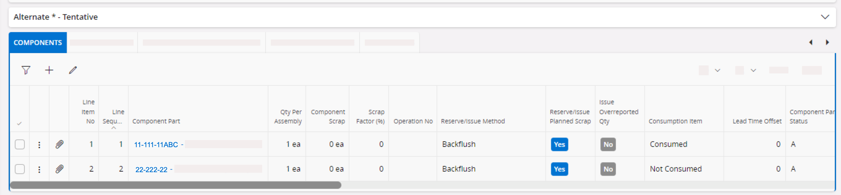 defines if a part is consumed or not consumed. Note:If the component is defined as an expense part, you can only set it as not consumed.
