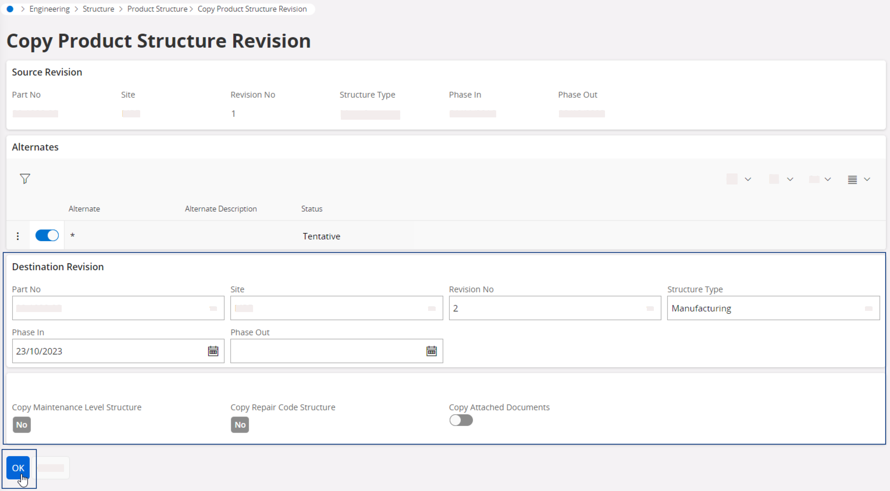 To validate the product structure, expand the box Alternate, then click .