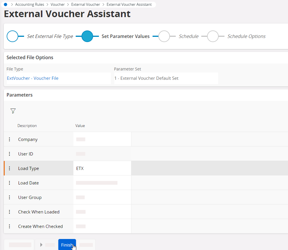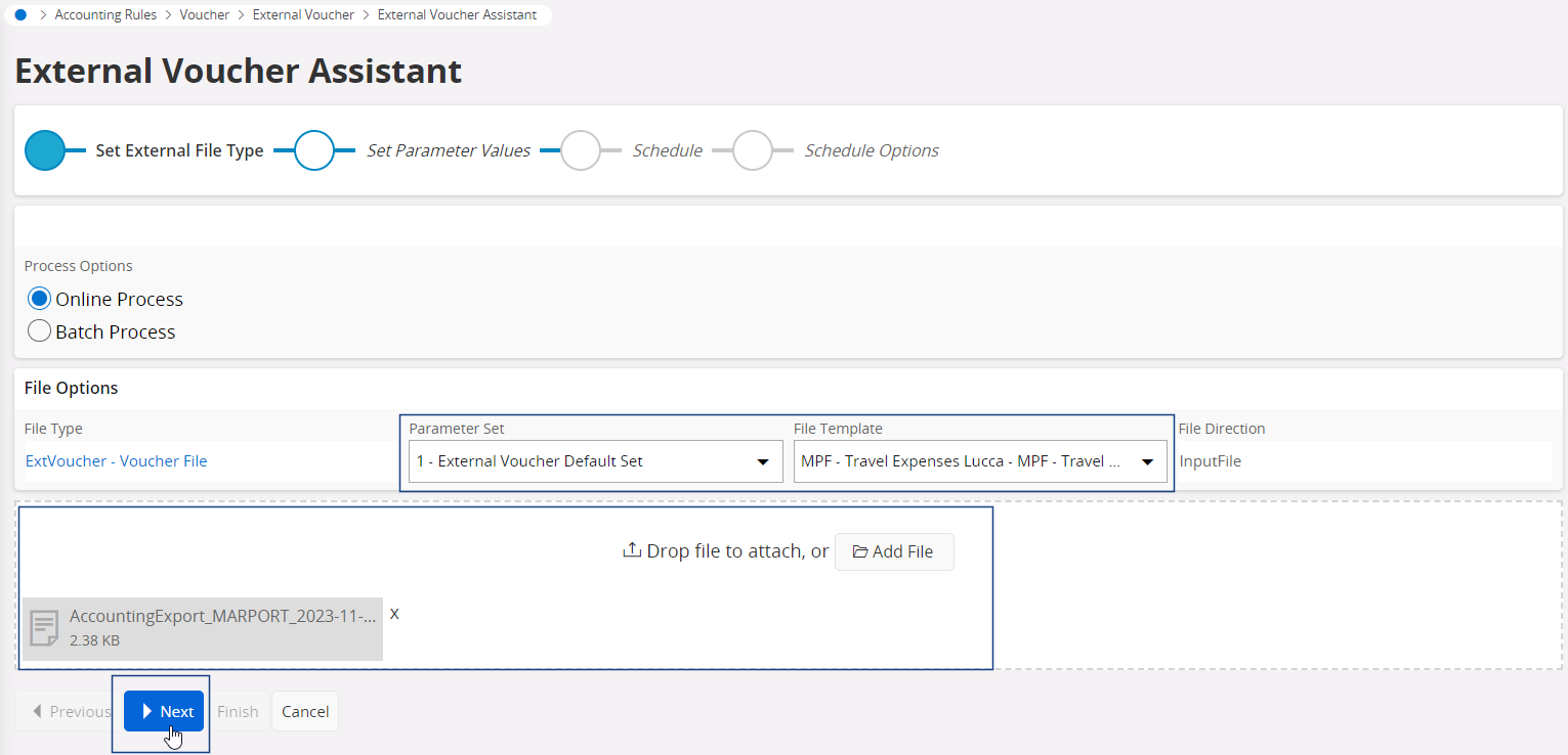 - Select a Parameter Set and a File Template according to the type of data you upload. The file template will match the fields in the file with the corresponding fields in IFS.